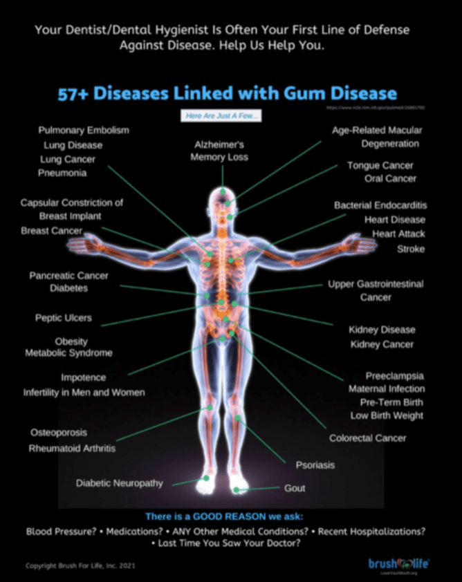 Current research on Periodontal disease (gum disease) has discovered the link between inflammation in the mouth and diseases of the body. This disease process sets up the “Oral - Systemic Connection.”